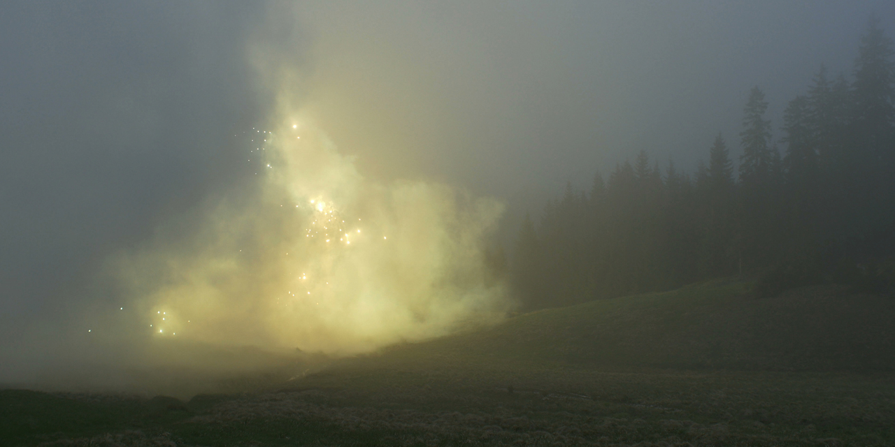 Vogelgezwitscher, sanft geschwungene Wiesen, Bäume, ein angrenzender Wald. Die Szenerie gehüllt in zarten Nebelschleier. Ein romantisches Naturbild, einsam, schwermütig, kontemplativ … bis Flugzeuggeräusche und laute Regieanweisungen aus dem Off die meditative Versunkenheit stören. Dichte Rauchschwaden von gezündeten Pyroeffekten kriechen langsam auf die Kamera zu, das Bild löst sich gänzlich im Weiß auf, wird zur reinen Projektionsfläche. Der Schleier lüftet sich, und mit ihm verschwindet die Romantik. Land Art über Film-Bilder, ihre Produktion und Rezeption, über magischen Schein und zerstörte Illusionen. Ein Post-Landscape- Landscape-Film. (Katalogtext Diagonale, mk)