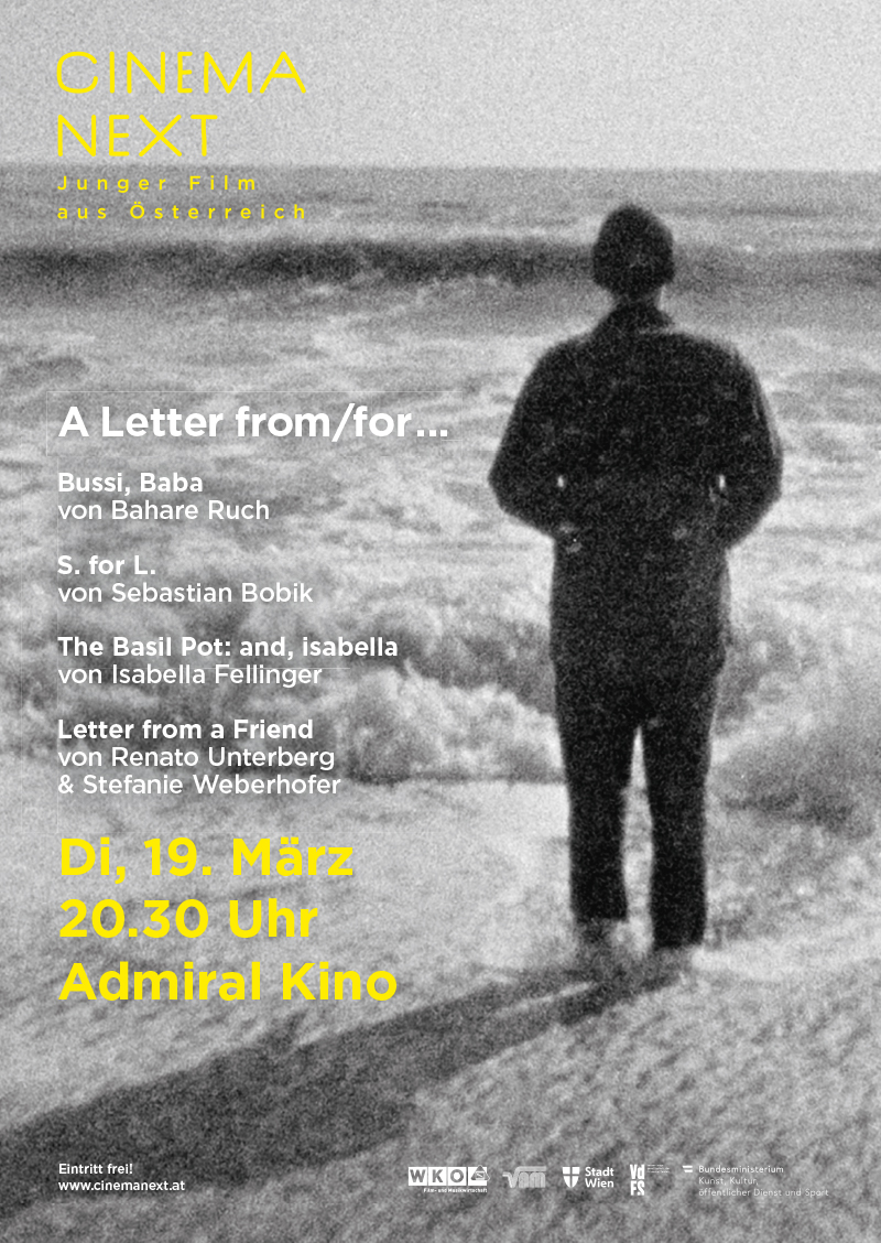 Bahare Ruch schickt mit Bussi, Baba ihrem Vater eine sehr persönliche Botschaft. Die Botschaft hinter S. for L. von Sebastian Bobik ist rätselhafter, klar sind nur der Absender S. und die Empfängerin L. In The Basil Pot: and, isabella ist die Empfängerin des Briefs eine Pflanze, Isabella Fellinger adaptiert ein Gedicht zu einer filmischen Ode. Und mit Letter from a Friend verfassen Filmemacherin Stefanie Weberhofer und Musiker Renato Unterberg gemeinsam zum Abschied einen langen Freundschaftsbrief.