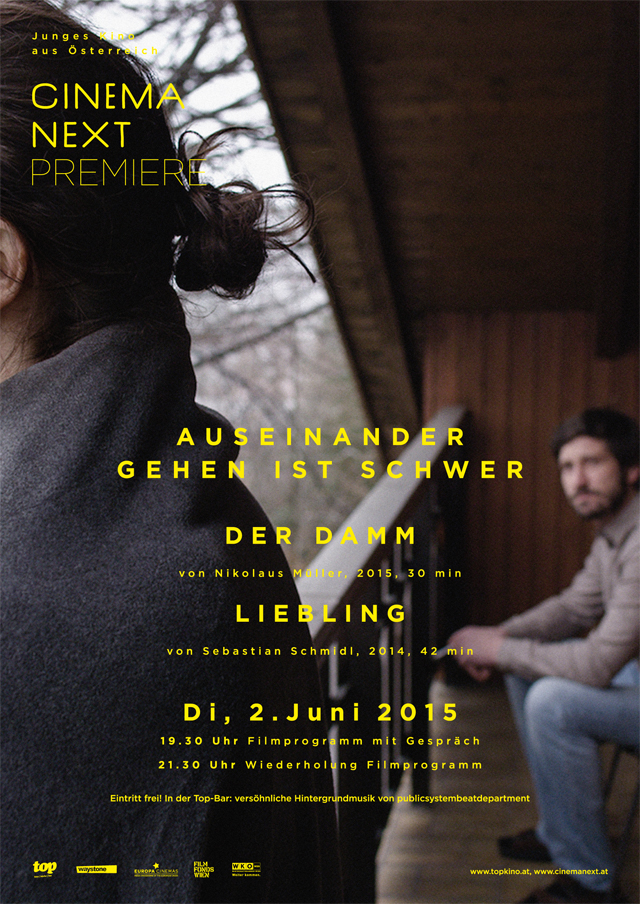 „Auseinandergehen ist schwer“ lautet ein Songtitel von WANDA. Das müssen auch die zwei Paare in den beiden Kurzfilmen erfahren, die bei diesem Cinema Next Special präsentiert werden. Nikolaus Müller schickt in Der Damm ein Paar auf einen letzten gemeinsamen Wandertag. Unvorhergesehenes lässt die zwei nochmals spüren, wie stark sie zusammen sein könnten. Bleibt Katharina bei ihrem Entschluss, ihren Freund Chris zu verlassen? Ganz entschlossen hingegen ist Tamara in Liebling von Sebastian Schmidl. Vor ihrem Auszug aus dem gemeinsamen Haus verbringt sie ein letztes Wochenende mit ihrem Freund Hans, der es nicht versteht, warum und wann sich seine Freundin von ihm abwandte. Auseinandergehen ist nicht nur schwer, sondern tut auch sehr weh. WANDA können ein Lied davon singen. Und Nikolaus Müller und Sebastian Schmidl feinfühlige Filme darüber machen.