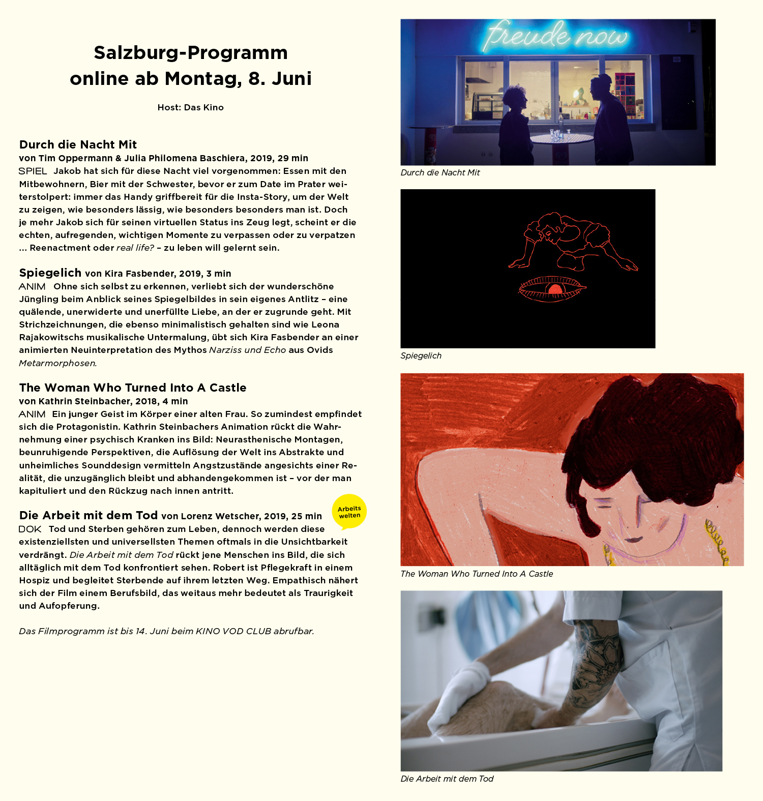 Das einstündige Programm vereint vier Filme, die die Bandbreite des Lebens auffächern: In Durch die Nacht Mit von Tim Oppermann und Julia Philomena Baschiera verpasst der jugendliche Jakob die guten Momente, weil er sein Leben nur als hastige Instagram-Story denkt. Digitale Selbstdarstellung als Krankheit unserer Zeit. Selbstverliebtheit thematisiert die schöne Animation Spiegelich von Mozarteums-Studentin Kira Fasbender in einer Neuinterpretation des Mythos Narziss und Echo. Kathrin Steinbacher, Salzburger Animationskünstlerin und aktuelle Preisträgerin des Jahresstipendiums des Landes Salzburg, visualisiert in The Woman Who Turned Into A Castle eindrucksvoll die Angstzustände einer älteren, psychisch kranken Frau angesichts einer Realität, die abhandengekommen ist. Von Menschen, die dem Leben entschwinden, erzählt auch der FH-Salzburg-Student Lorenz Wetscher in seinem Abschlussfilm Die Arbeit mit dem Tod: In seinem behutsamen Kurzdokumentarfilm beobachtet er die Pflegearbeit jener, die Sterbende auf ihrem letzten Weg begleiten.