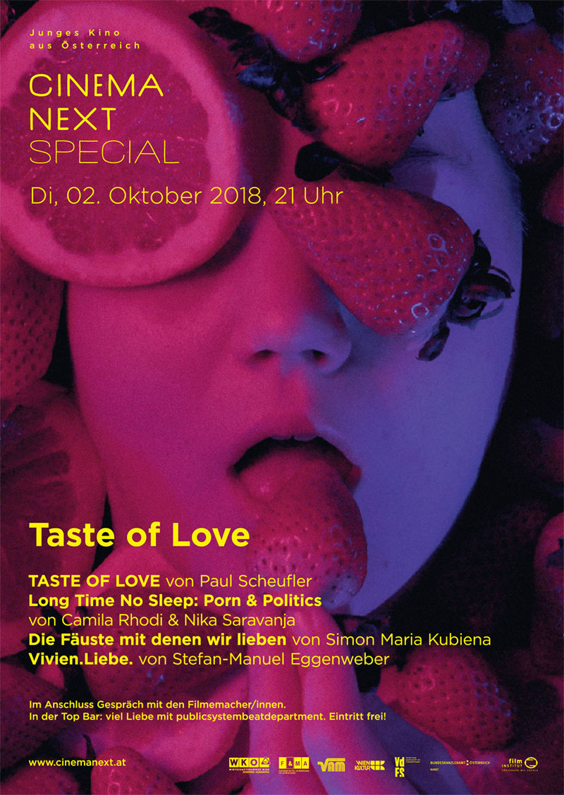 Wie schmeckt die Liebe? Wie fühlt sie sich an? Vier junge Menschen nähern sich dem Gefühl filmisch an: Paul Scheufler macht den kulinarischen Vergleich und sucht auf der bunten Speisekarte nach sinnlichen Verlockungen und Ekstasen. Camila Rhodi und Nika Saravanja suchen keine Analogien, sondern den direkten Weg: im Bett sitzend wird von persönlichen Liebesbeziehungen erzählt. Bei Simon Maria Kubiena wird das Gefühl schmerzvoll, vor allem dann, wenn sich mehrere Menschen eine Liebe teilen. Auch Stefan-Manuel Eggenberger fragt sich: Kann man zwei Menschen zeitgleich lieben? Die Antwort kommt auch hier nicht ohne Blut aus: Nein.