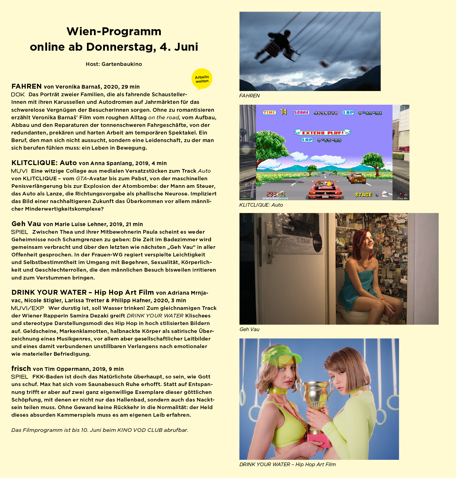 Das Programm beginnt mit dem Kurzdokumentarfilm FAHREN von Veronika Barnaš über mit ihren Karussellen und Autodromen umherziehenden Schaussteller/innen. Die feministischen Musikerinnen KLITCLIQUE besingen in Auto ebenfalls das Fahren, das sie klar männlich konnotieren, und die Filmkünstlerin Anna Spanlang bebildert die maschinelle Penisverlängerung mit einer witzigen Collage. Um Geschlechterrollen geht es auch im Kurzspielfilm Geh Vau von Marie Luise Lehner: In der Frauen-WG regiert verspielte Leichtigkeit und Selbstbestimmtheit, die den männlichen Besuch irritieren. Für Genre-Irritation sorgt DRINK YOUR WATER von Adriana Mrnjavac, Nicole Stigler, Larissa Tretter & Philipp Hafner: Aus Hip-Hop-Videos vertraute Bildwelten und stereotype Gesten werden hier amüsant zugespitzt. Der Kurzfilm frisch von Tim Oppermann macht den Abschluss des Wien-Programms: Max erhofft sich vom ersten FKK-Saunabesuch Ruhe und Erholung. Doch ganz so leicht ist das einfach-nur-Nackt-sein dann doch nicht.
