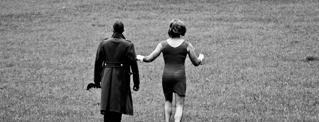 Dreharbeiten von Der brennende Beidl, ein „Glanzstück des Trash“ – Georg Blume, in Kleid und High-Heels, flieht vor einem Jäger.
