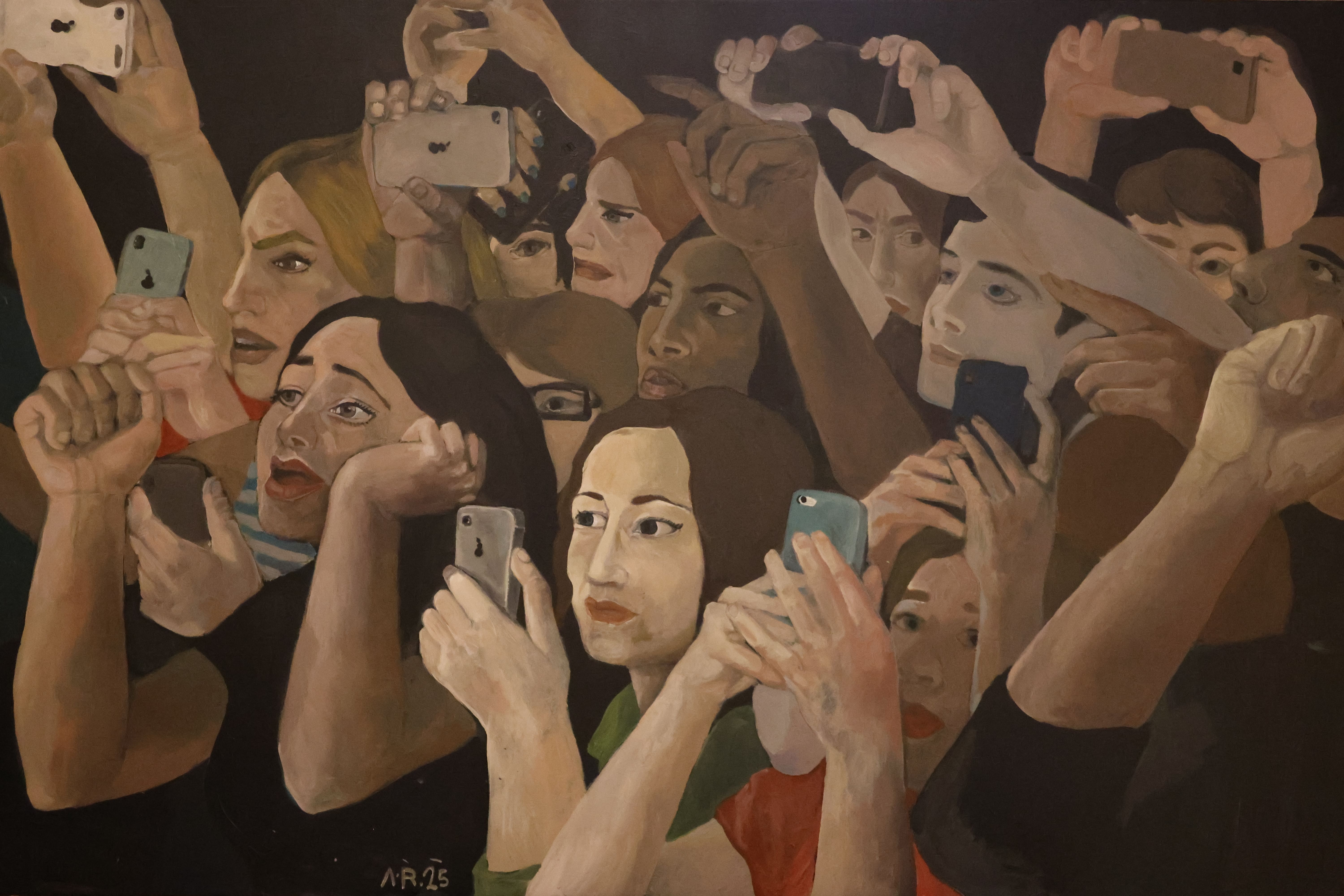 In meiner aktuellsten Reihe an Malereien geht es um Menschenmassen und damit assoziierte Empfindungen. Ich interessiere mich für dieses Thema seit der Pandemie, also seit etwa 2020, als sich für mich, so wie für viele Andere, die Empfindung von Menschengruppen und Menschenmassen völlig verändert hat. Diese Wahrnehmung hat mich bis heute geprägt und dazu veranlasst, mehr zu erforschen, was Gruppen und Ansammlungen emotional bedeuten können und inwiefern sie die Grenzbereiche zwischen Miteinander und Gegeneinander reflektieren.