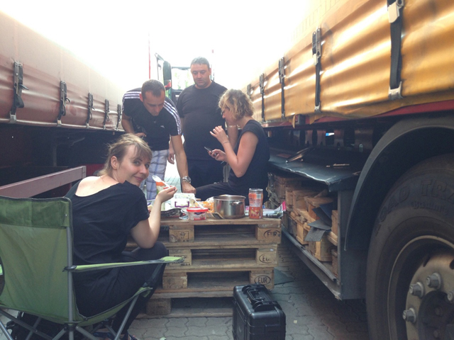 Frau-Sein hat sie jedenfalls noch nie als Nachteil empfunden. Eher hat sie das Gefühl, dass die Leute sich Frauen bereitwilliger öffnen. Dass das manchmal auch daran liegen könnte, dass sie nicht ganz ernst genommen werden, schiebt sie lachend hinterher: „Mit den LKW-Fahrern kamen wir recht leicht ins Gespräch, sie waren positiv eingestellt, als zwei Frauen auf sie zukamen, sagen wir mal so. Ich hab’ zwei der Männer bei einem Skypegespräch gefilmt und mich gefreut, dass sie so angeregt miteinander reden. Ich hab’ natürlich kein Wort verstanden und erst in der Übersetzung kapiert, dass sie die ganze Zeit schweinische Sachen gesagt haben. So kann’s halt auch kommen.“