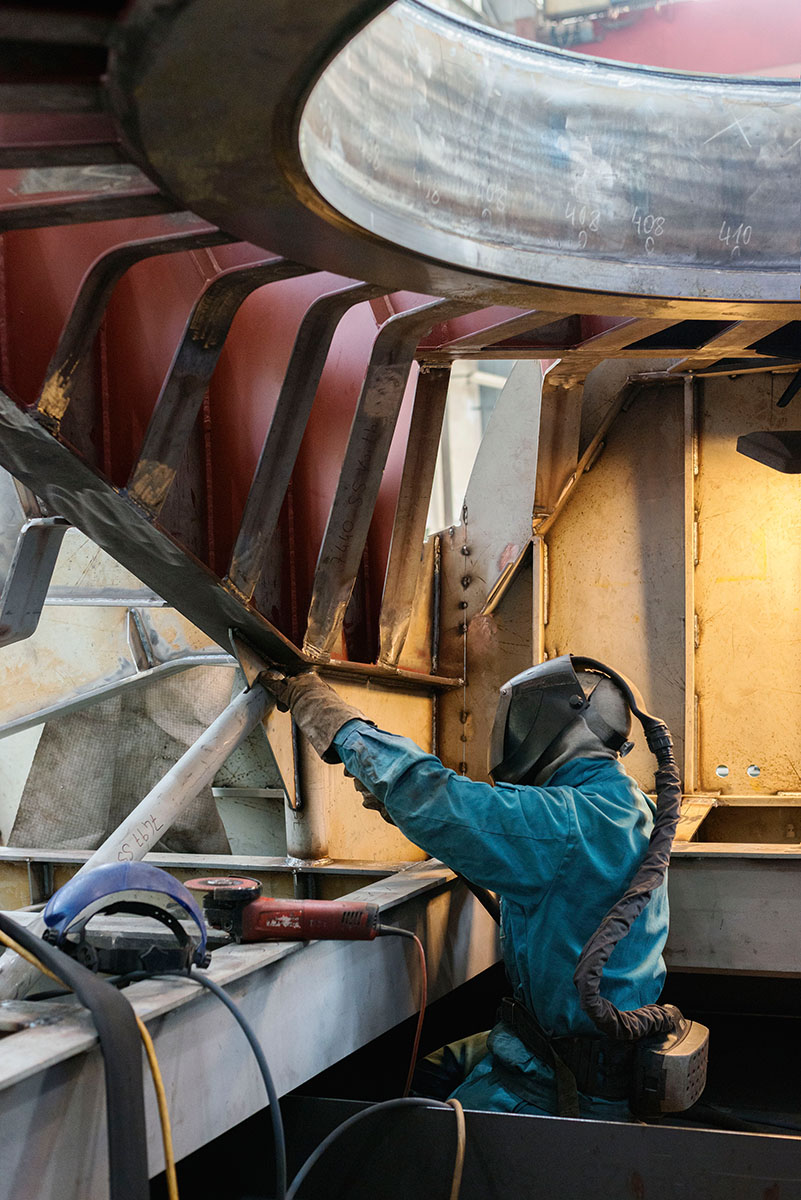 Bodies of Work ist eine Auseinandersetzung mit dem Thema Arbeit, für die ich über eineinhalb Jahre den Bau einer Seefähre in der Linzer Schiffswerft begleitet habe. Es ist keine ausschließlich dokumentarische Fotoserie, sondern sie umfasst abstrahierte Bilder, die die Verwandtschaft des Schiffbaus zur Raumfahrt und die Fragilität der Arbeiterkörper herausarbeitet. Sie zeigen die Verbindung von Körper und Werkstück, die im handwerklich Prozess entsteht, und thematisieren auch Fantasien zukünftiger Arbeit, Stichwort Cyborgs!
