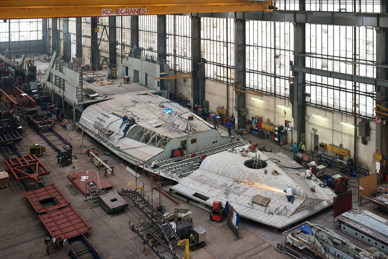 Aufgrund der 180-jährigen Betriebsgeschichte treten in der Werft interessante zeitliche Verschränkungen zutage. Man könnte sagen, ein seltsam anachronistischer Futurismus entsteht, wenn der Schiffsrumpf aus erhöhter Perspektive Assoziationen an Science-Fiction-Raumschiffe auslöst, deren Gestaltung sich stets an der Ästhetik der fertigenden Industrie orientiert hat. Das Aufgreifen der Analogien von Arbeitskluft und Raumanzug sowie das Motiv des (Raum-)Schiffs als Sinnbild für Abenteuer und Entdeckungen – aber auch für Flucht – boten die Möglichkeit, den spezifischen Ort der Werft zu entkoppeln und damit zu anderen Bedeutungsebenen zu gelangen.