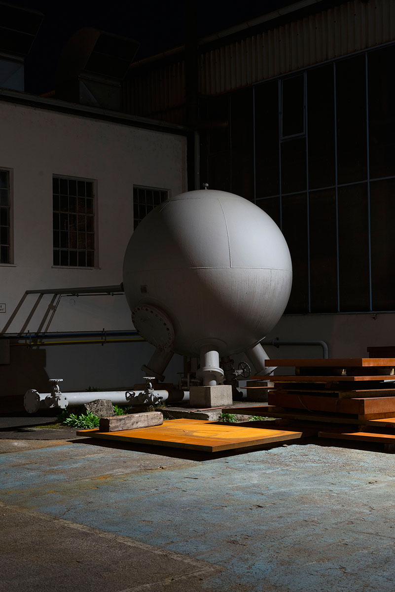 Nachts erscheint das Betriebsgelände in anderem Licht, und auch so war es möglich, Gegenstände wie diesen Presslufttank abseits seiner Funktion im Arbeitsprozess mit einer anderen Bedeutung aufzuladen.
