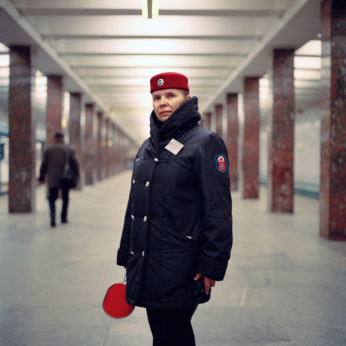 Auffällig waren für mich die Frauendarstellungen in den älteren Stationen der Metro im Vergleich zu den aktuell propagierten Frauenbildern in Populärkultur und Werbung. Zwar sind ihre Körper ebenso idealisiert, jedoch tragen sie häufig Gewehr, Presslufthammer und Arbeitskleidung und sind seltener als Ehefrau und Mutter dargestellt. Das Bild der arbeitenden Frau setzte sich für mich im Metropersonal fort, das zu großen Teilen aus ernsten Frauen in adretten Uniformen bestand. Angetan von ihrer Ausstrahlung und aufgrund meines Interesses an der Arbeitswelt in der Metro wurden die „Metro Ladies“ zu einem wichtigen Schwerpunkt innerhalb der Fotoserie.