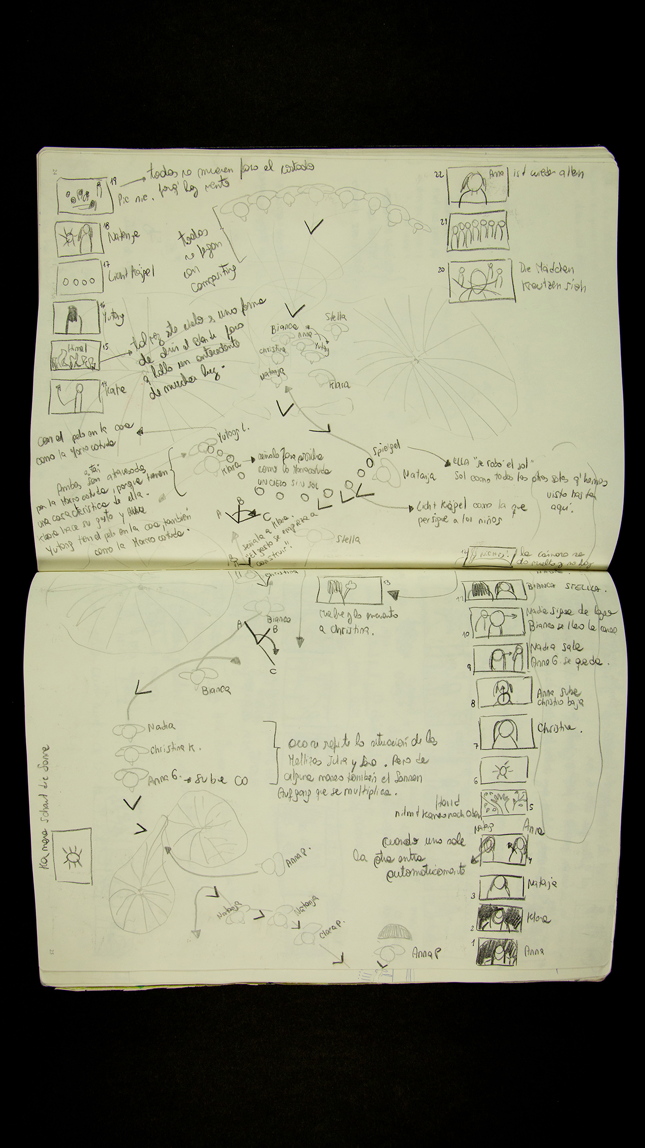 . Zweites Bild: Skizzen, die Luz für die Planung des knapp fünfminütigen One-Takes angefertigt hatte; zu sehen ist ein Teil des Designprozesses der Choreografie für Kamera und Schauspiel. Drittes und viertes Bild: Stills aus der Filmsequenz