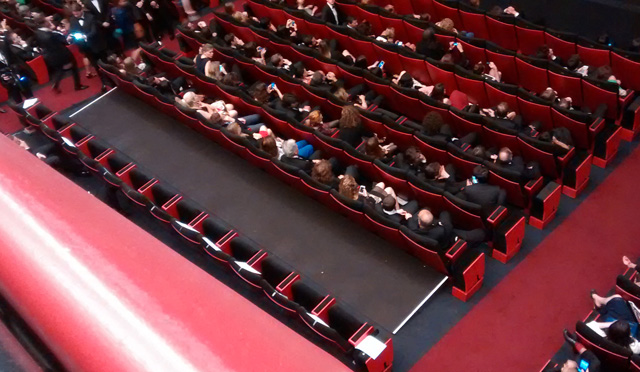 Dann am Ende der Treppe noch schnell ein Foto. Für mich, für die Mama und vielleicht auch für Facebook. Während gerade Colin Farrell durch das Blitzlichtgewitter schreitet, betrete ich das Palais. Wieder Sicherheitskontrollen. Diesmal mit Metalldetektoren. Ob das früher schon so war oder Charlie Hebdo seine Spuren hinterlassen hat, ich weiß es nicht. Und dann gehe ich ins Grand Auditorium Louis Lumière. Dieses riesige Kino mit fast 2.300 Sitzen. Es herrscht Getümmel. Bestimmt 100 PlatzanweiserInnen verteilen die Zuschauer auf ihre Sitze. Auf der Leinwand sieht man live, was gerade auf dem roten Teppich passiert.