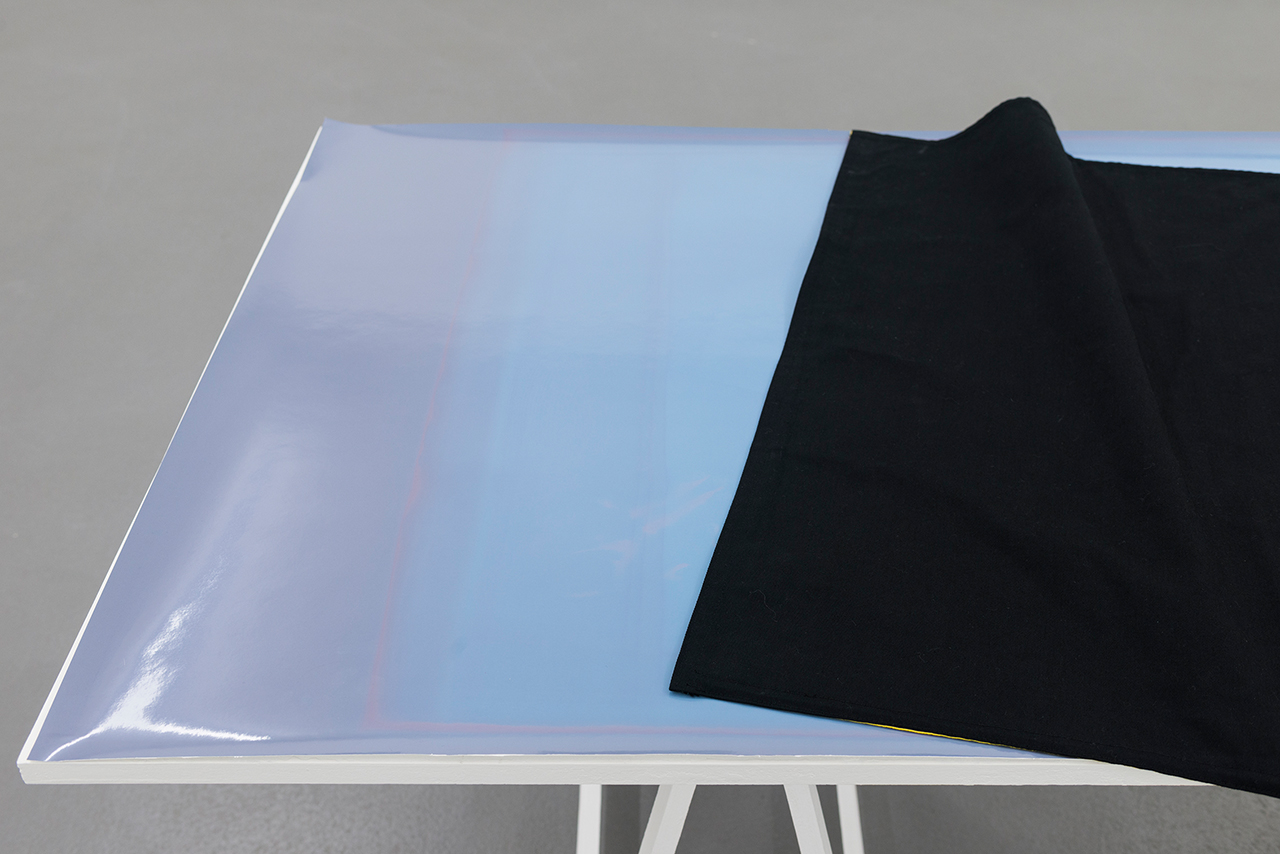 Das Bild zeigt eine Detailaufnahme der prozesshaften, fotografischen Arbeit Gestures of Collectivity, in der sich viele der vorhin genannten Aspekte meiner Arbeitsweise widerspiegeln. Die Installation besteht aus einem auf einer Tischplatte ausgebreiteten lichtempfindlichen Stück Fotopapier und einem schwarzen (Einstell-)Tuch, welches das Papier vor Lichteinwirkung schützt. Über die Dauer der Präsentation entsteht im Ausstellungsraum durch Gesten der Betrachtenden ein fotografischer Abdruck dieses Stoffes, der immer wieder bewegt und neu positioniert wird. Die Arbeit ist ein gutes Beispiel für meinen konzeptuellen Umgang mit dem fotografischen Material, das die kollektive Einschreibung in ein abstraktes, sich stets veränderndes Bild ermöglicht.